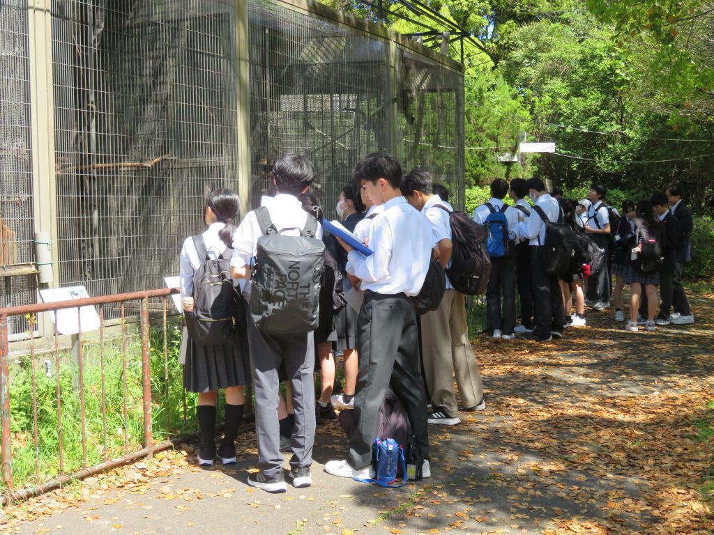 午後は日本モンキーセンターへ移動し、午前中の講義の内容を踏まえて、霊長類の行動観察を行いました。グループに分かれ、観察対象種3種について、「瞬間サンプリング」の手法を用いて観察をしました。