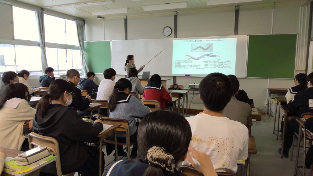 本特別講義は3年理系生物選択の生徒を対象とし、3回に分けて行います。名古屋大学 森郁恵 名誉教授より線虫C. elegansの学際研究について紹介していただき、同大学野間健太郎准教授より、線虫の観察、デモ実験を行っていただきます。