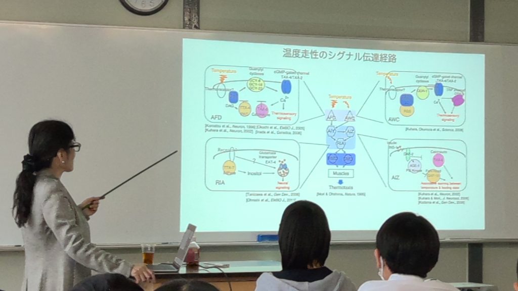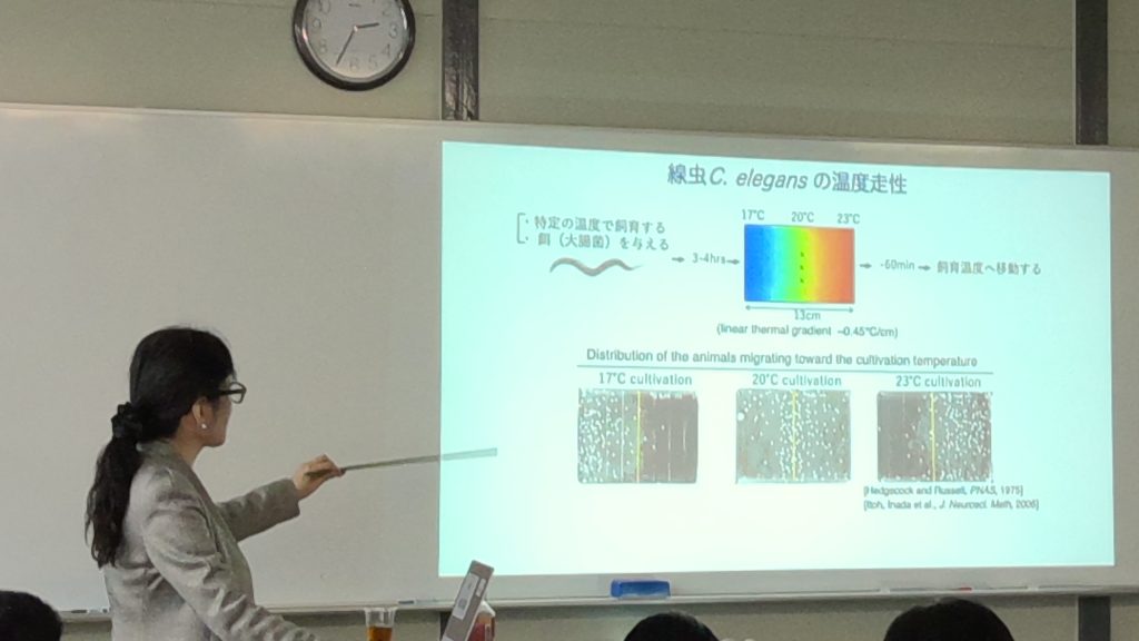 講義では、線虫が自分が餌を得た温度を「記憶」し、その温度を好むように行動する(温度走性)ことや、シナプスを介さずに記憶を保持する細胞があることなど、驚くべき生態が紹介されました。また、雌雄同体と雄の2種類の個体が存在し、1個体で受精できるというユニークな繁殖様式にも関心が集まりました。