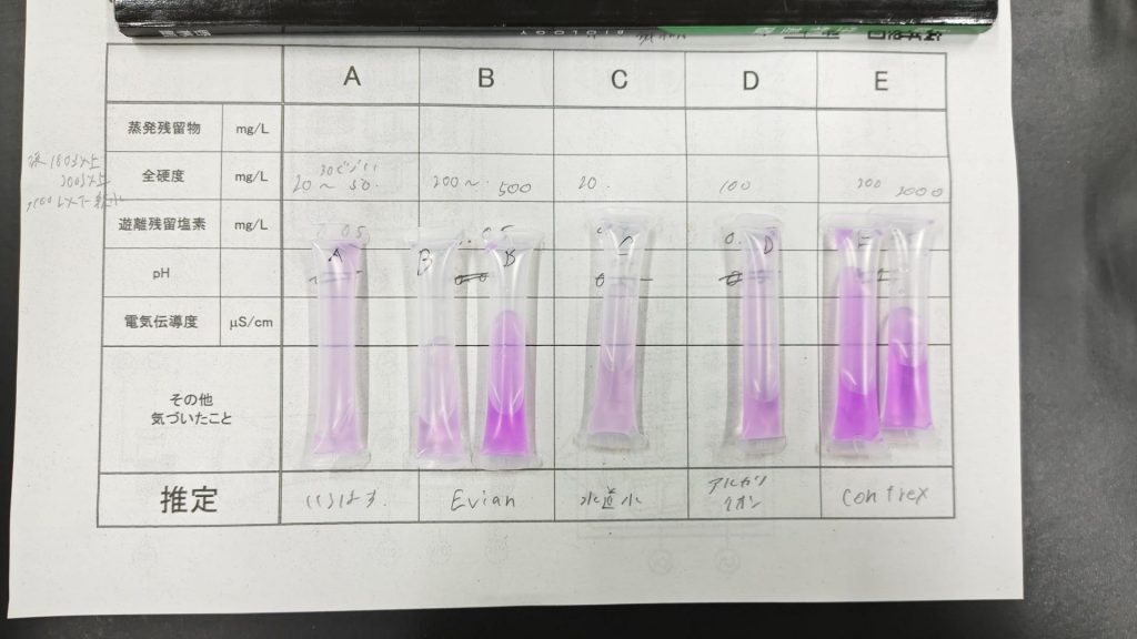 蒸発残留物(演示実験)・全硬度・遊離残留塩素・pH・電気伝導度の測定に取り組みました。