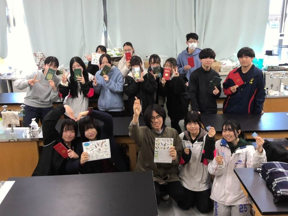 1年生の生徒みんなが頑張って多くの生物種を発見・投稿したため、主催者から生き物観察手帳や野鳥観察下敷きなどの景品をいただきました。頑張りましたね!!