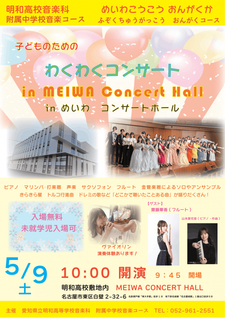 | 子どものための わくわくコンサート | 5月9日(土) | MEIWA CONCERT HALL | 全席自由 未就学児入場可 |